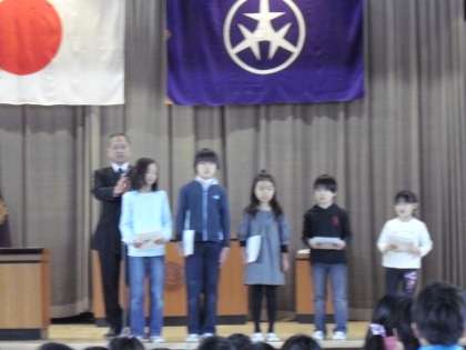 各学年の代表児童に“各学年の修了証”を授与している場面です。