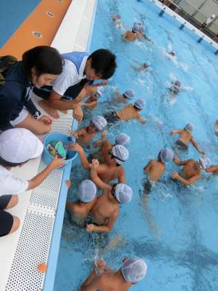 今日は、中学年の水泳指導最終日で、検定を行いました。夏休みや学期中の練習の成果を発揮して、級が上がった児童もいました。