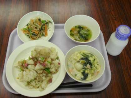 今日の献立は、桜の花ずし、牛乳、白玉汁、ごまあえです。
