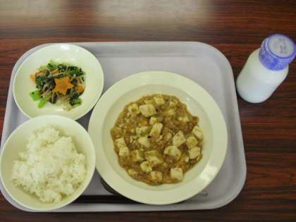 今日の献立は、ごはん、牛乳、麻婆豆腐、塩ナムルです。
