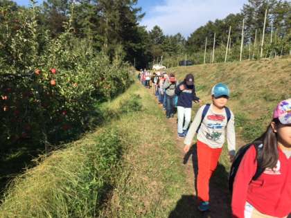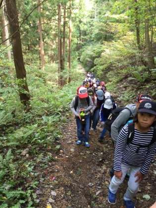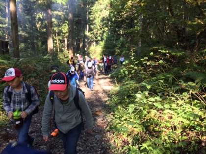 りんご園など景色を楽しみながらのハイキングです。徐々に山道が険しくなっていきましたが、みんな頑張って登っています。