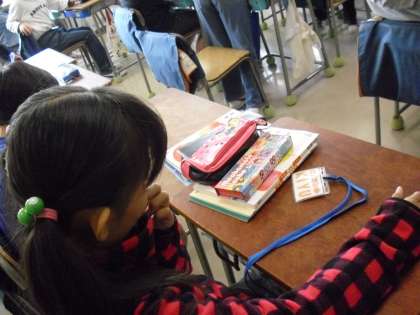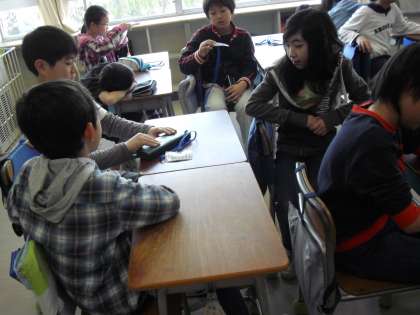 朝の会の前に・・・友達とたのしいひととき・・・節電意識が強く・・先生が来るまでの間・・蛍光灯を消していました。さすがに“エコアドバイザー”です。