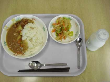 今日の献立は、カレーライス、牛乳、福神漬け、野菜のごま風味です。