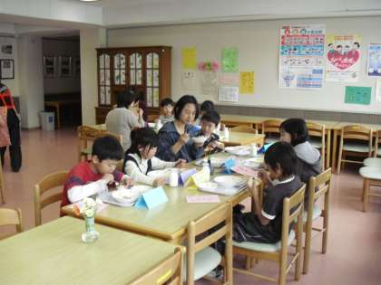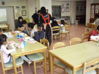 今日は、“4月の誕生日給食”をランチルームで行いました。給食メニューのほかにオレンジシャーベットがつきました。