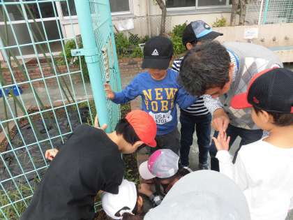 まず、本物の種を見たり、どのように種が運ばれるかの仕組みのお話を聞いたりしました。国語「たねのたび」で学んだ種や、その種に似た運ばれ方をする種も登場し、国語の学習を思い出しながら話を聞きました。次に、校庭で種探しをしました。3年生が育てているひまわりや、4年生が育てているヘチマ、他にも花壇をよく見てみると、いろいろな種を見つけることができました。最後に、教室に戻って種の模型を紙で作りました。作った模型を落としてみると、くるくると床まで落ち、歓声があがりました。種が運ばれる不思議を自分で作り、試してみることもでき、体験の中で種の不思議を学ぶことができました。