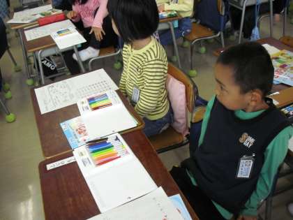1年生の1時間目は、“算数”・・・算数ノートで学習・・・どの子も頑張っていました。間違ってしまった子も・・・すぐにやり直してできました。校長先生も担任の先生と○つけを手伝いました。