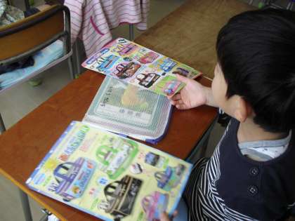 朝の会で・・・“絵の具”案内を・・・おうちにある人、兄弟や姉妹の道具がある子は、それを使って・・・などの説明をしながら、パンフレットを配布していました。