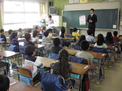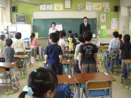 “朝の会のあいさつ・健康観察”が終わり・・・今日から、TTで1年生の指導にあたる先生の紹介がありました。全校児童朝会でも全校児童に紹介しました。