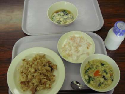 今日の献立は、中華おこわ、牛乳、にら玉スープ、フルーツヨーグルトです。調理さんが、アレルギー給食を作りました。後ろの小皿です。