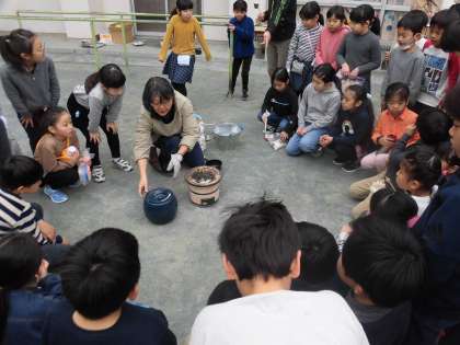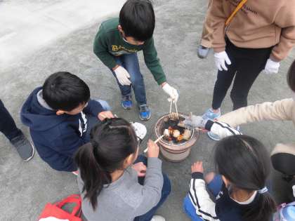 今日は七輪の体験をしました。お手本では簡単に炭に火がついたのに、実際にやってみるとなかなか火がつかずとても大変だったようです。よい経験になりました。火がついた後は、持ってきたお餅を焼いておいしくいただきました。