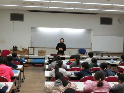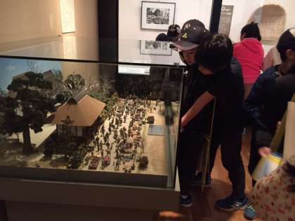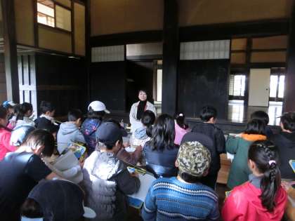 郷土資料館での様子です。大場家の代官屋敷を見学して、郷土資料館で昔の道具の説明を聞きました。その後、資料館見学をしました。