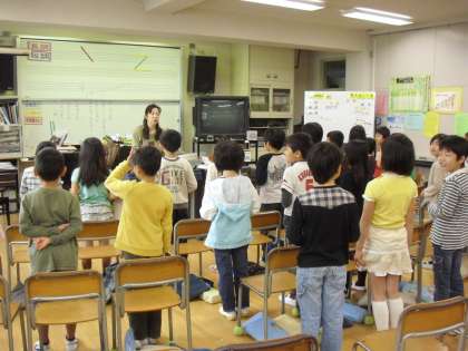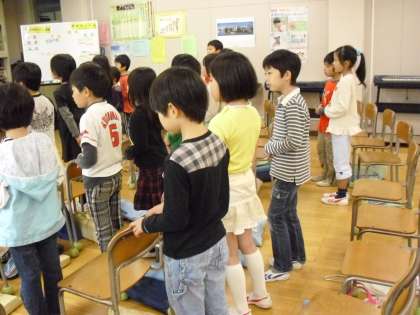 1時間目の授業は、“専科授業:音楽”・・・・音楽の時間の最初は、“発声練習”おなかから声を・・・きれいな声で・・・曲は、“愉快に歩けば・・・”です。
