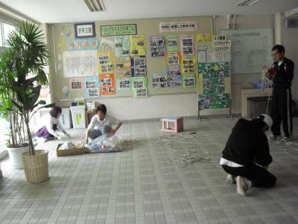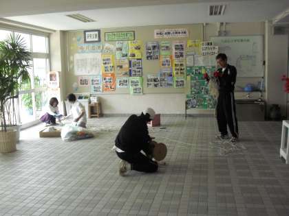 九品仏小の校庭にたくさんの“こいのぼり”が泳いでいました。今日、主事さん方が、ロープを外して・・・こいのぼりをしまう作業をしました。