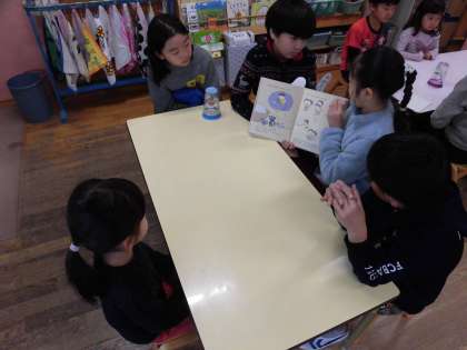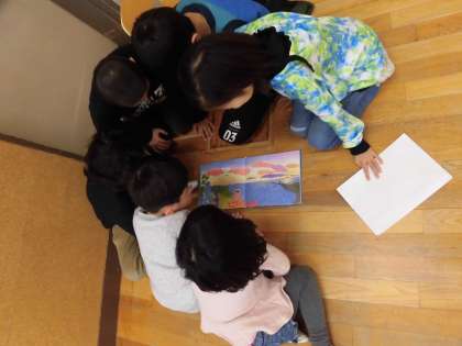 12グループに分かれて、年長さんが楽しめる絵本を選び、今日に向けて一生懸命練習を重ねてきました。お話の世界がさらに広がるように、ペープサートで動作化したり、クイズを考えたりするなど、工夫がちりばめられた楽しい読み聞かせになりました。