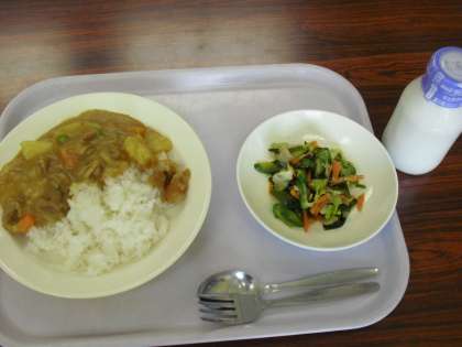 今日の献立は、カレーライス、牛乳、福神漬け、わかめサラダです。