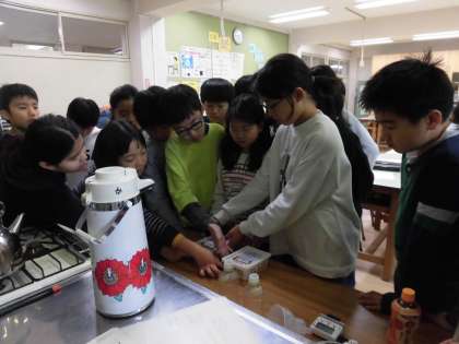 サーモカメラに映った自分の顔を見て驚いたり、カップ焼きそばのカップを使った実験で、寒い季節を快適に過ごすためのヒントとなる「空気の層」の保温効果を体感したりすることができました。