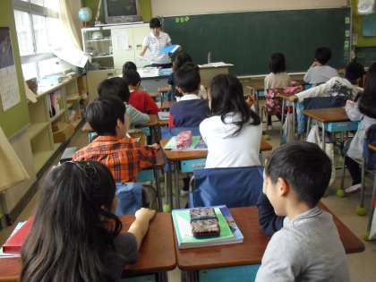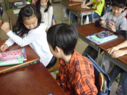 健康観察が終わり・・・配布物を配るところです。朝の会のときも真剣にお話を聞いています。