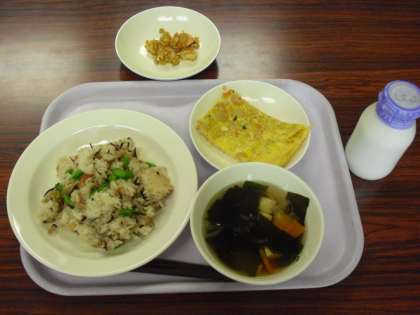 今日の献立は、豆入りひじきごはん、牛乳、すまし汁、卵焼きです。今日もアレルギー対応食を調理員さんが作りました。