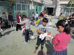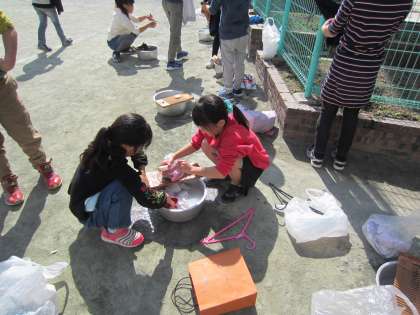 始めは「簡単そう。」と、言っていた子どもたちも実際にやってみると、汚れを落とすのに何度も洗濯板にこすりつけなければならないことや、脱水するときに何度も何度も絞り、時間と力が必要なことなど、体験を通して学ぶことができました。「今は、洗濯機のボタンを押すだけで、自動でやってくれるから、本当に楽になったな。」という声がたくさん聞こえました。時代とともに便利になってきたのですね。