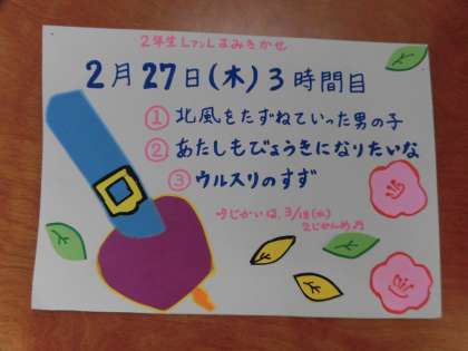 今日の3時間目は、3月のLアンL読み聞かせの時間でした。今日は、「北風をたずねていった男の子」「わたしもびょうきになりたいな」「ウルスリのすず」の3作品を話していただきました。北欧の昔話や、雪国で暮らす子の物語など、まだまだ寒い日の続くこの時期にぴったりのお話で、楽しい本の世界を味わうことができました。毎回、読んだいただいた本を学級に貸し出してくださっていて、児童毎月楽しみにしています。「北風をたずねていった男の子」が収録されている『北欧の昔話』には、他の昔話もたくさん入っています。児童たちには、LLをきっかけに様々なお話に出会ってほしいです。LLの保護者のみなさま、本日はありがとうございました。