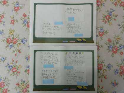1年間、それぞれがんばってきた姿を見てきました。友達と一緒にますます大きく成長していけるはずです。すてきな5年生になってね。今から楽しみにしています。