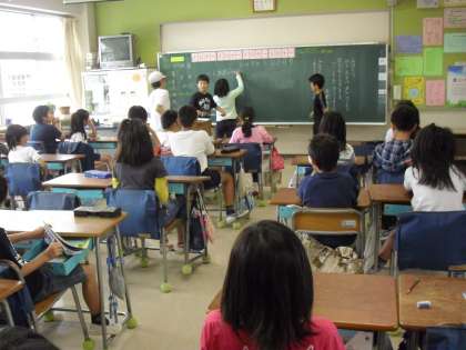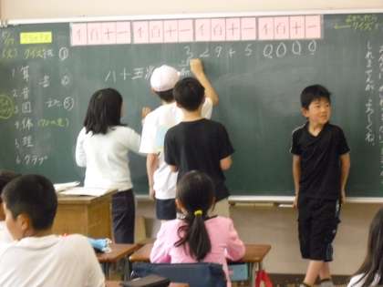 朝学習・・・係の子が“算数:大きな数”の問題を出題して・・・みんなが取り組んでいました。黒板で答えている子もいました。