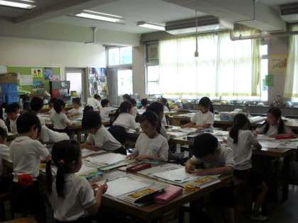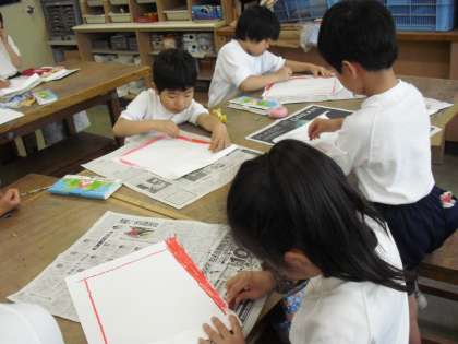 専科授業・図工の学習・・・“運動会で飾る旗”を作製していました。