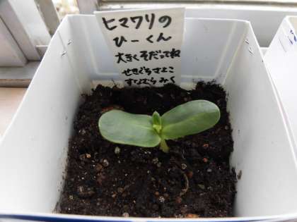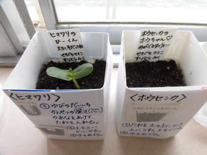 来週は、ヒマワリとホウセンカのたねをまきます。先生たちも一足先にまきました。そうしたら、こんなにかわいい「め」が出てきましたよ。みなさんも、ぎゅうにゅうパックを2つよういして、そだててみましょう。みなさんのたねも元気にそだちますように。