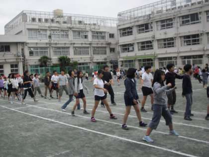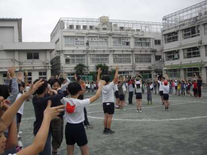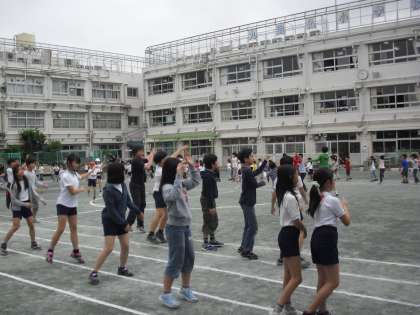 中休みに全校児童・教職員で、九品仏音頭の練習をしました。地域・親鳩の会のボランティアの方に委員会の子ども達が教わり・・・全校で練習をしました。