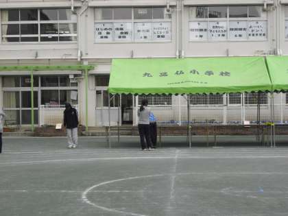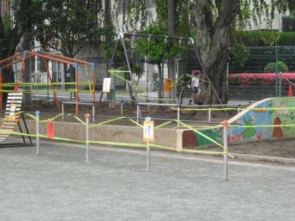 遊具にすずらんテープで注意事項を・・・準備は・・・OK!