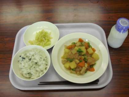今日の献立は、わかめとじゃこのご飯、牛乳、しんじゃがいものそぼろ煮、キャベツのレモンじょうゆかけです。