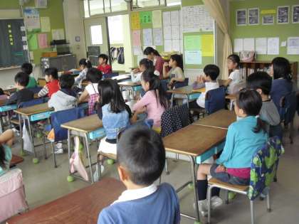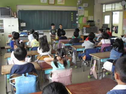 画面は、朝の会:日直のスピーチ・・・友達と遊んで、“青虫”をとった時の話をしていました。