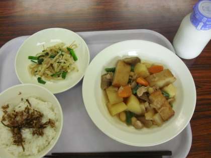 今日の献立は、ご飯、かみかみ佃煮、牛乳、豆入り筑前煮、もやしのごま風味です。
