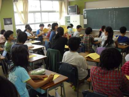 朝の会前に・・・“縦割り全校遠足”のリーダーに担当の先生から話をしていました。子どもの国の地図を見て、確認している子もいました。