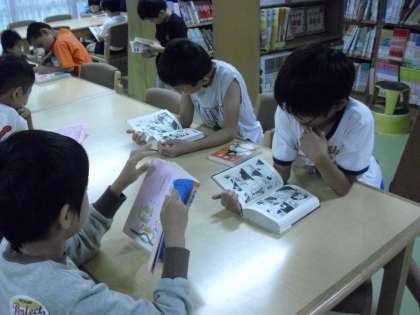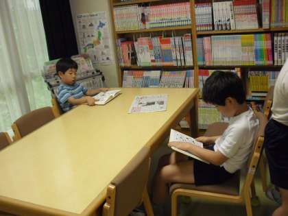 外は、雨・・・室内遊びを工夫したり、図書室で本を読んだりしていました。