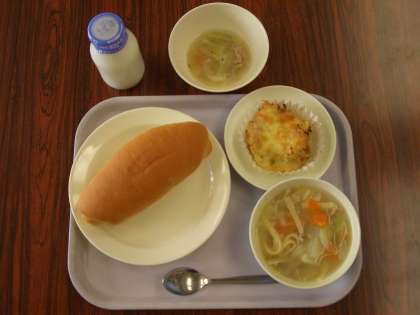 今日の献立は、ミルクパン、牛乳、ヌードルスープ、ポテトのチーズ焼きです。