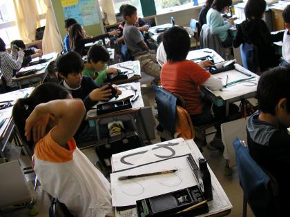 今日の練習は、ひらがなの「わし」です。準備の仕方から、墨のすり方、筆はこびなど、手順をおって丁寧に指導しています。限られた時間の中での「習字」なので、繰り返して基本の指導をしています。子どもたちも真剣に取り組んでいます。