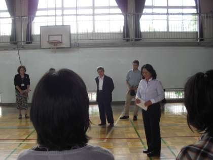 訓練後・・・子どもたちに警察の方からお話・・・子どもたちは、訓練終了・・中休みになり・・・教職員は、玉川警察の方から・・・講評と改善策についてお話がありました。