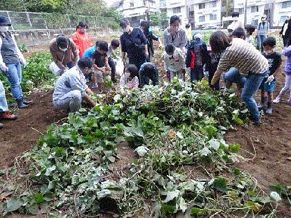 重いつるを皆で力を合わせて巻きました。つるを巻いていると、トカゲやカマキリ、いも虫などが出てきて、いも掘り以外の発見もありました。