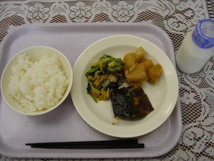 今日のメニューは、ごはん、牛乳、さばのみそ煮、じゃがいもの甘辛煮、煮びたしです。