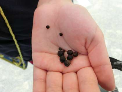 次に、校庭でたね探しをしました。3年生が育てているヒマワリ、4年生が育てているへチマ以外にも、すべり台の近くや花壇の奥などをよく探してみると、色々なたねが見付かりました。九品仏小学校にも、実はこんなにたねがあったのですね。