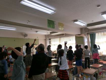 そして最後に、教室で3種類のたねの模型を作り、たねのふしぎを体験しました。自分たちで作ったたねを落としてみると…、本物のたねと同じようにくるくると回りゆっくり床に落ちました。