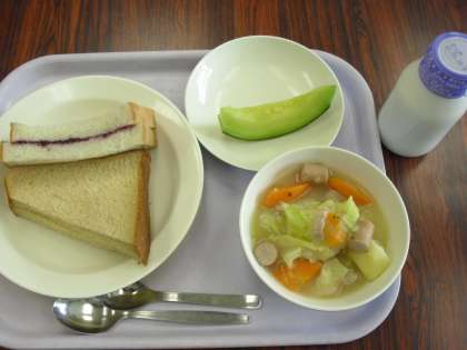 今日の献立は、二色サンド、牛乳、ポトフ、くだものです。