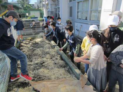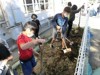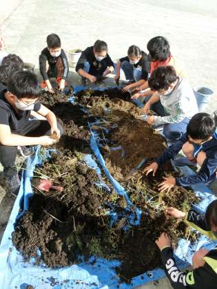 まず、稲の根をほぐし土を軟らかくします。その後、米ぬかと草木灰を混ぜていきます。子どもたちは1時間休むことなく活動し、ようやく田おこしが終わりました。「5年生全員でおこなったのにとても時間がかかった。」と、手作業で行う大変さを実感できたようです。