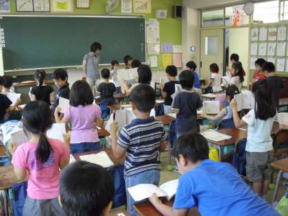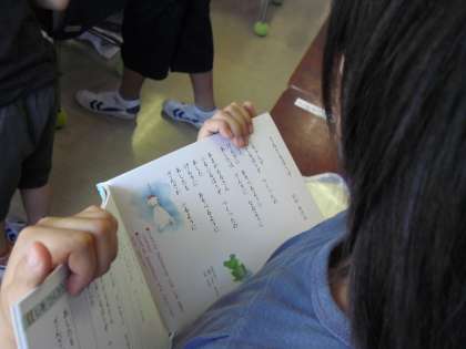 今日も元気な1年生・・・朝のあいさつの前に・・・“音読”先生とリーダーの声に合わせて大きな声で読みました。“てるてるぼうず:江口あけみさんの詩”です。