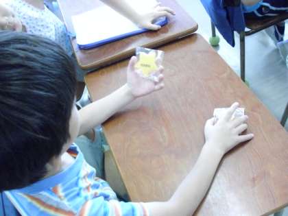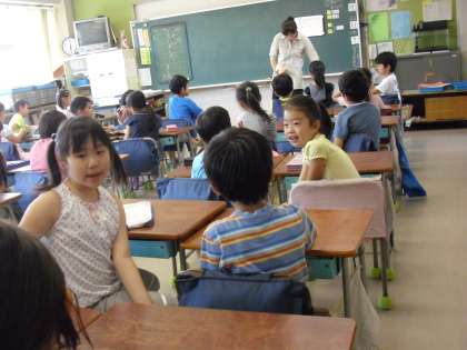 明るい2年生・・・朝の会で先生から、交通安全のキーホルダーを受け取っているところです。