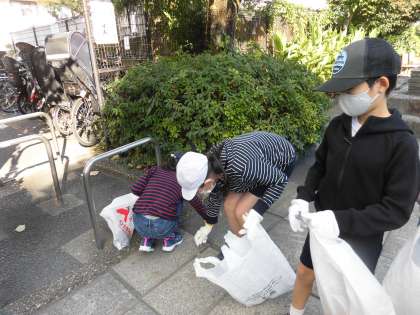 2年生と5年生で地域清掃に行き、たてわり班で九品仏商店街と奥沢六丁目公園のゴミ拾いをしました。