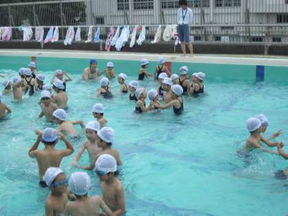 昨日、プール開きを中学年“3・4年生”で行いました。今日は、低学年のプール開きを行いました。画面は、水慣れ・・・猛獣狩りに行こうよ・・・担任バージョンで楽しみながら、水慣れをしました。