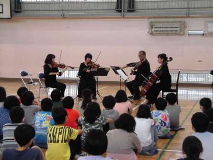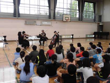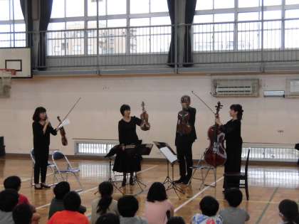 いつもの体育館が今日はコンサートホールになり、弦楽四重奏の優雅で素敵なハーモニーが響き渡りました。どこかで一度は聞いたことのあるモーツアルト「アイネ・クライネ・ナハトムジーク第1楽章」や、映画「美女と野獣」等のよく知っている音楽まで、たくさんの曲を間近で聞くことができ、その音色の美しさに子どもたちは聞き入っていました。また、「弦楽四重奏曲第12番ヘ長調『アメリカ』op.96第1楽章」ではチェコ出身のドヴォルザークがアメリカで触れあった様々な人種の人たちやそこでの経験を基にして曲が書かれています。曲を聴いていると日本や中国の東洋の感じもし、なんだか懐かしい感じのする不思議な曲でした。国は違っても曲で世界が一つになったと感じさせてくれました。