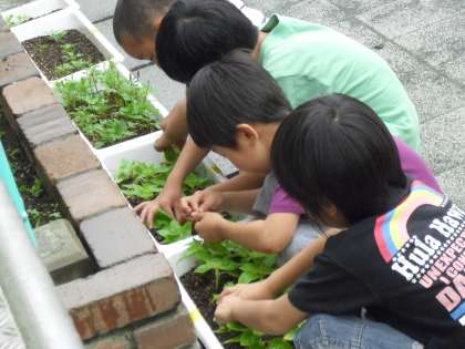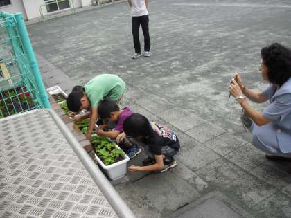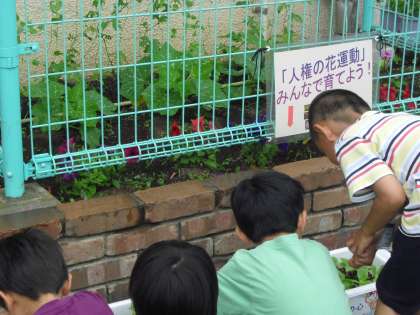 中休みに1年生の係の子ども達が、“人権の花の世話”をしました。ちょうどそこに、担当の方が花の育ち方を見に来ました。順調に葉をつけています。